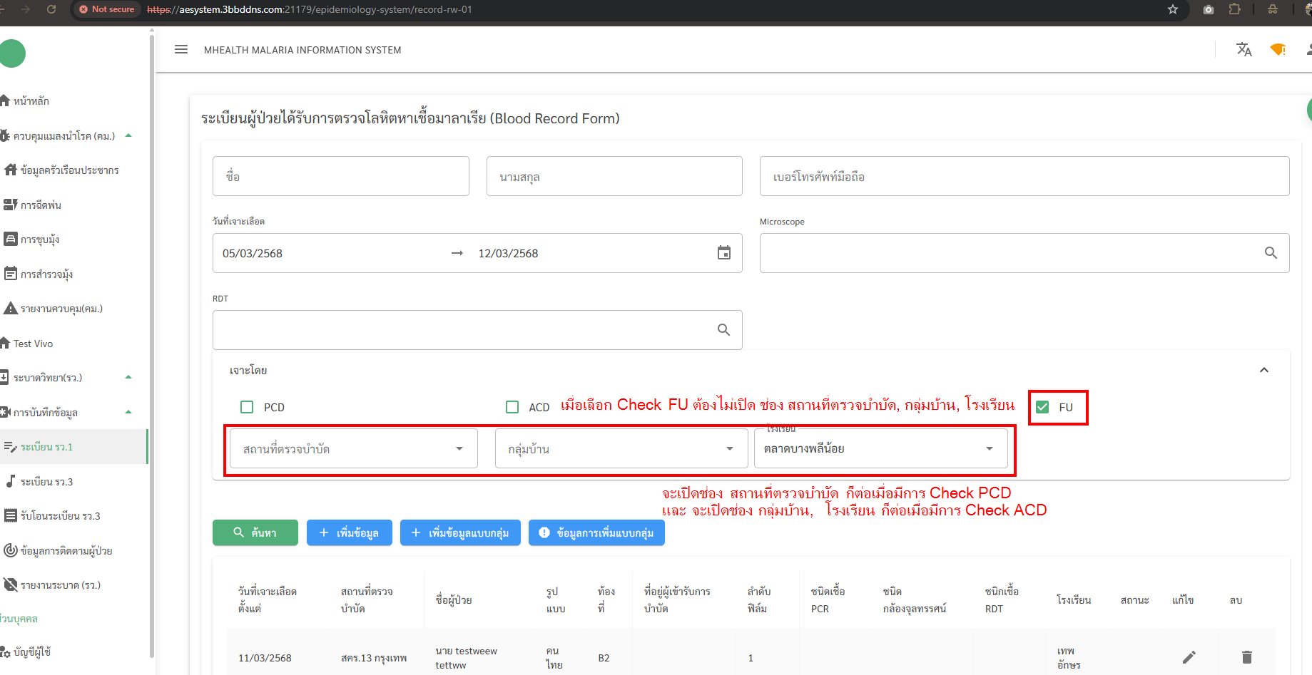 - Subject changed from [รว/ระเบียนการตรวจโลหิตหาเชื้อมาลาเรีย] ค้นหา > Check box FU to [รว/ระเบียน รว.1] ค้นหา > Check box FU