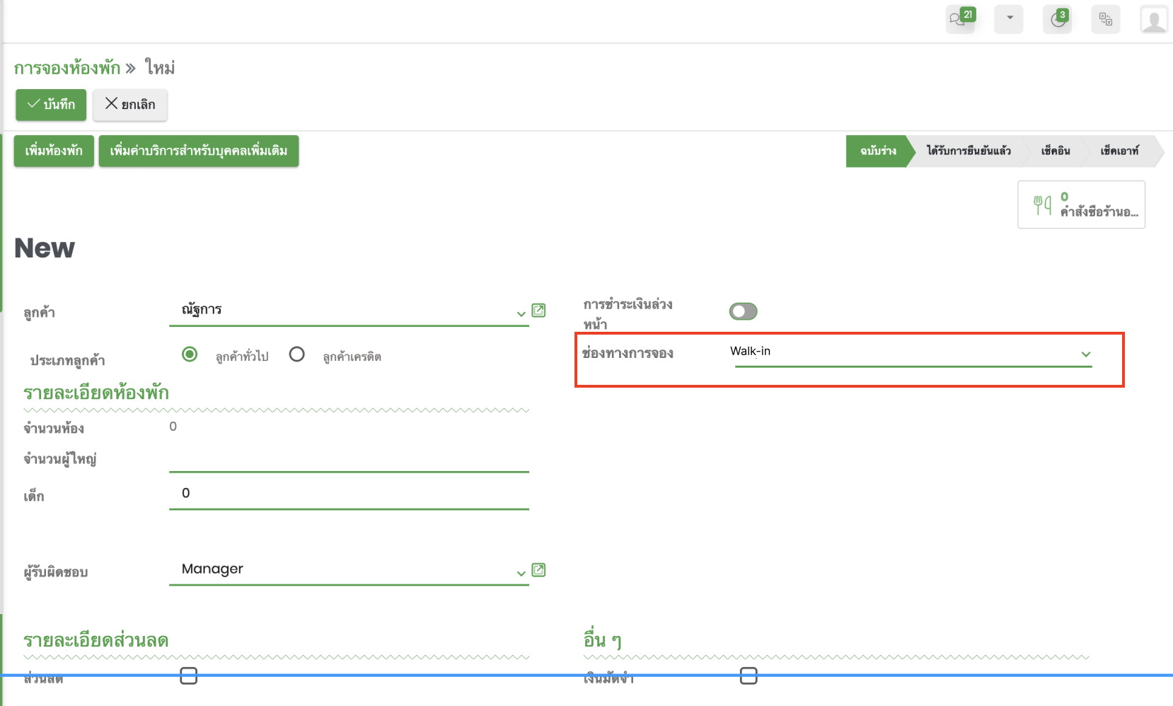 1)เพิ่ม Dropdown ช่องทางการจอง ทืั่หน้าบันทึกการจอง โดยข้อมูลใน Dropdown ประกอบด้วยข้อมูลดังนี้