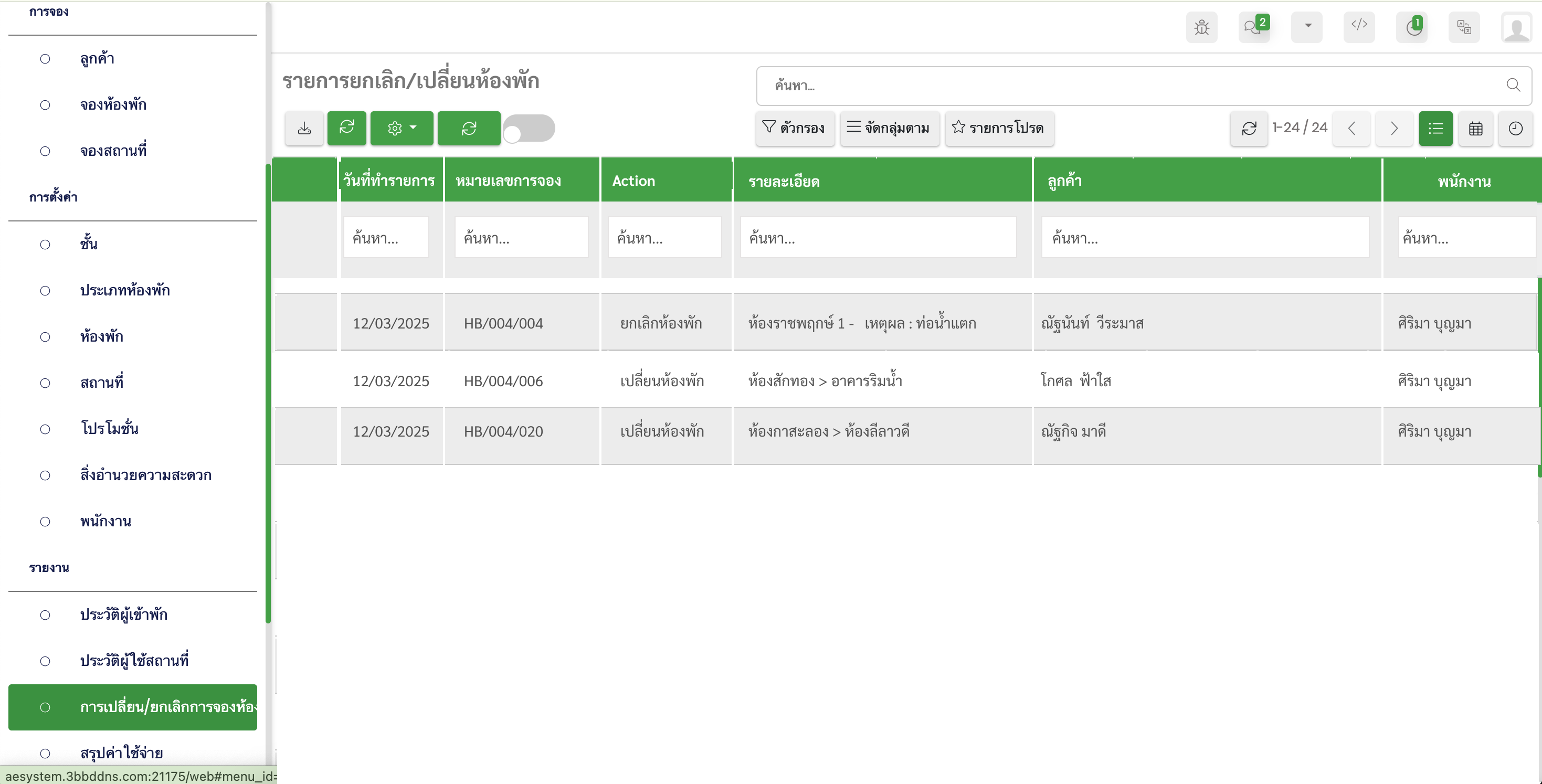 จัดทำหน้าประวัติการยกเลิก / เปลี่ยนห้องพัก เพื่อให้พนักงานกะถัดไปทราบ