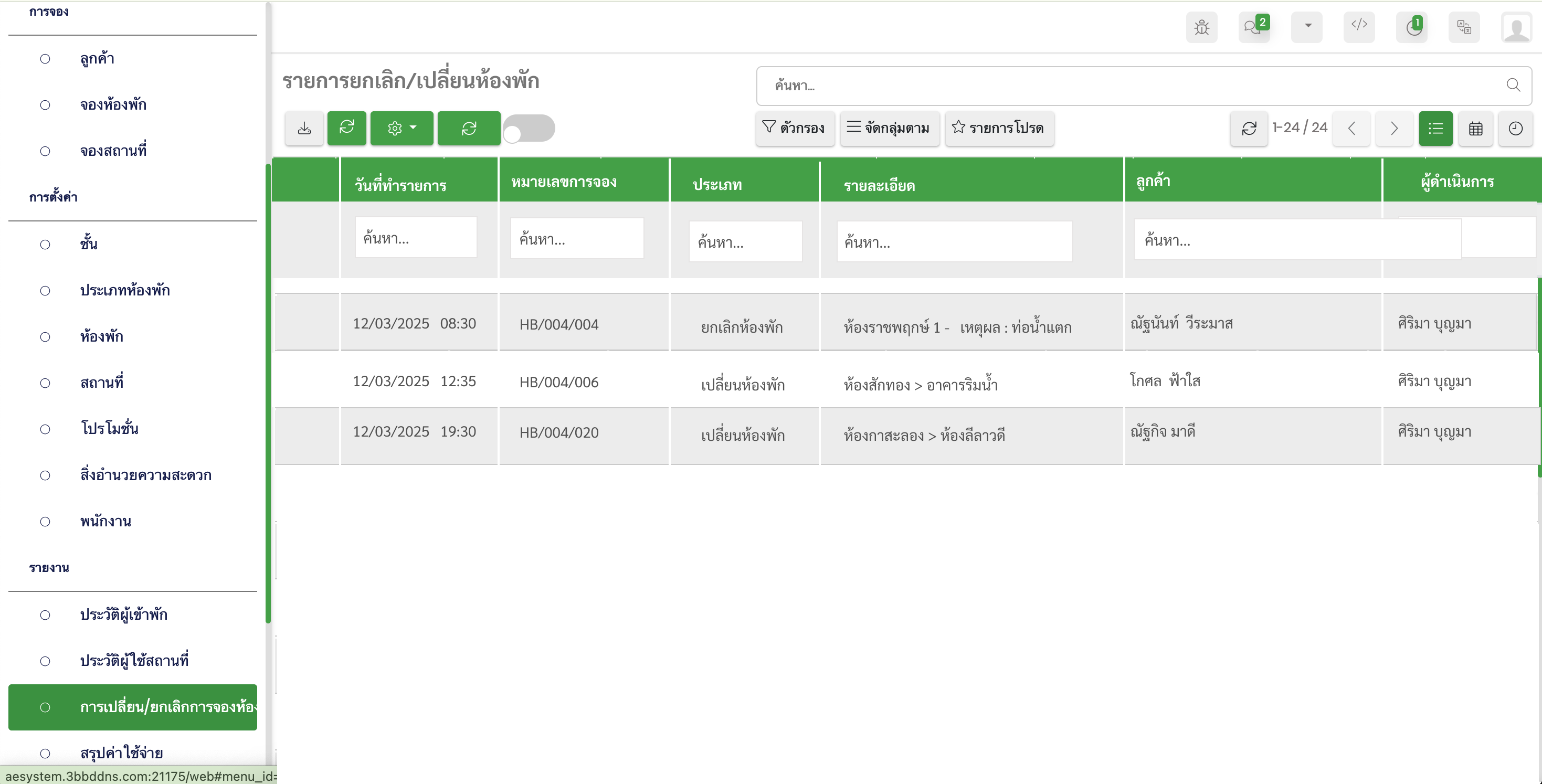 เรียงลำดับการแสดงข้อมูลตาม วันที่และเวลา ที่ยกเลิก/เปลี่ยนห้องพัก จากล่าสุด → ไปเก่าสุด