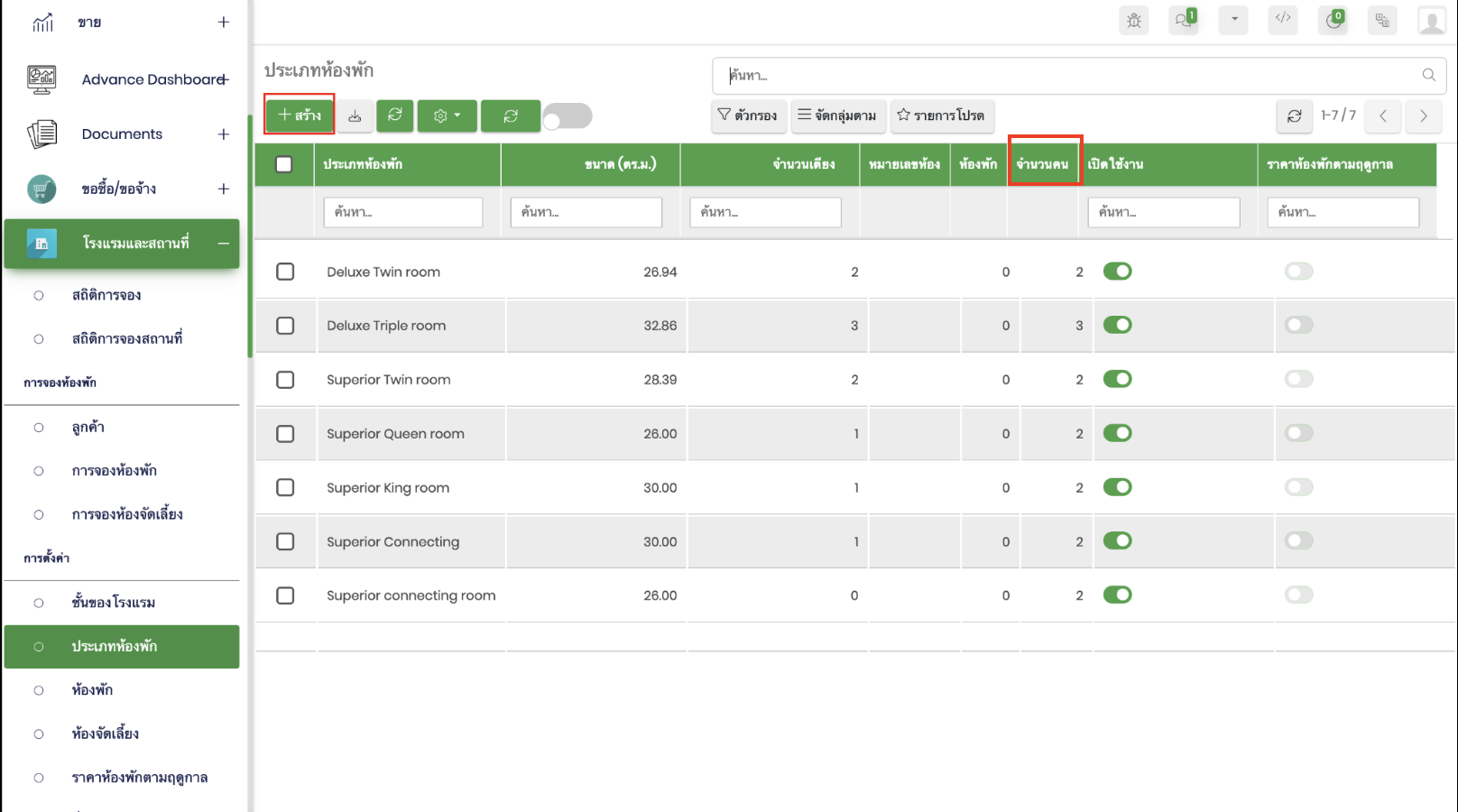 หน้ารายการประเภทห้องพัก > แก้ไขชื่อหัวเรื่อง จากคำว่า "จำนวนคน" เป็น "ความจุ"