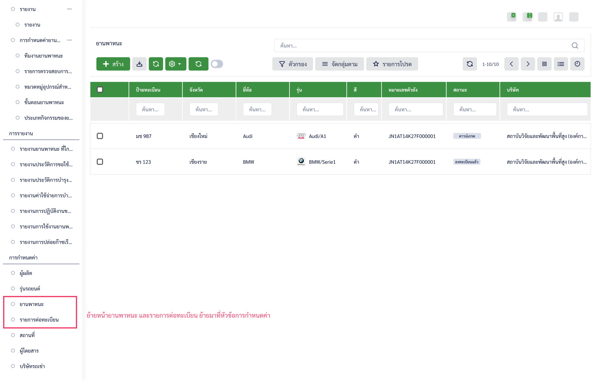 จัดการย้ายหน้ายานพาหนะ และรายการต่อทะเบียน ย้ายมาที่หัวข้อการกำหนดค่า