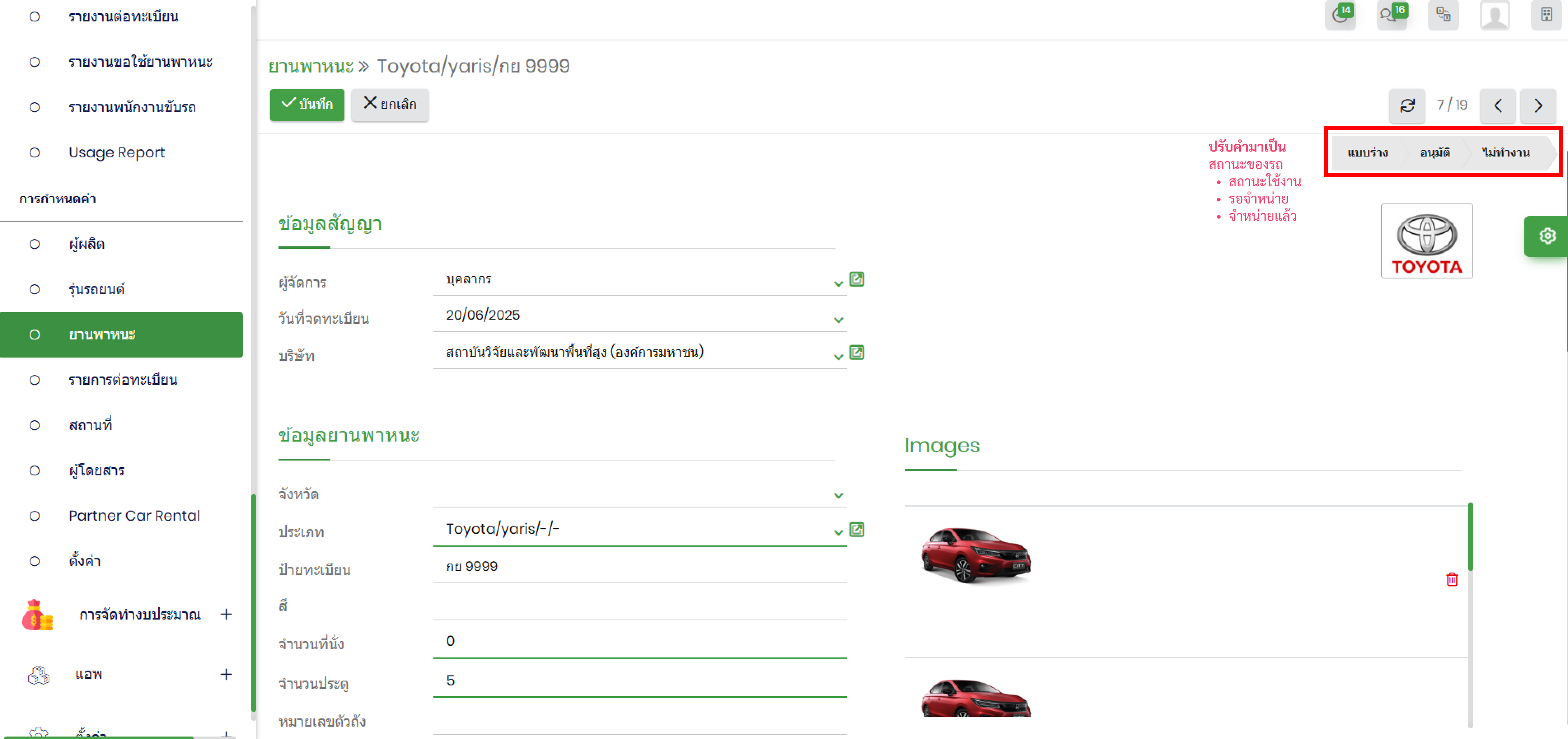4.New Request #2383: 4.3.1 สามารถเพิ่ม แก้ไข ยกเลิกข้อมูลยานพาหนะได้ เช่น หมายเลขทะเบียนยานพาหนะยี่ห้อ รุ่น โมเดล ปี หมายเลขตัวถัง (Chassis Number) จำนวนที่นั่ง จำนวนประตู สี วันที่จดทะเบียน ปริมาณการปล่อยก๊าซคาร์บอนไดออกไซต์ต่อ 1 กม. เป็นต้น
