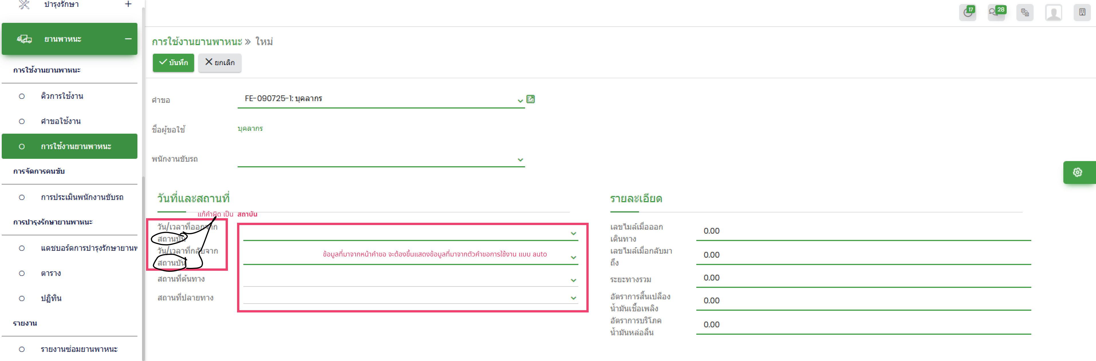 หน้าการใช้ยานพาหนะ > แก้คำผิดและปรับข้อมูลที่จะแสดง