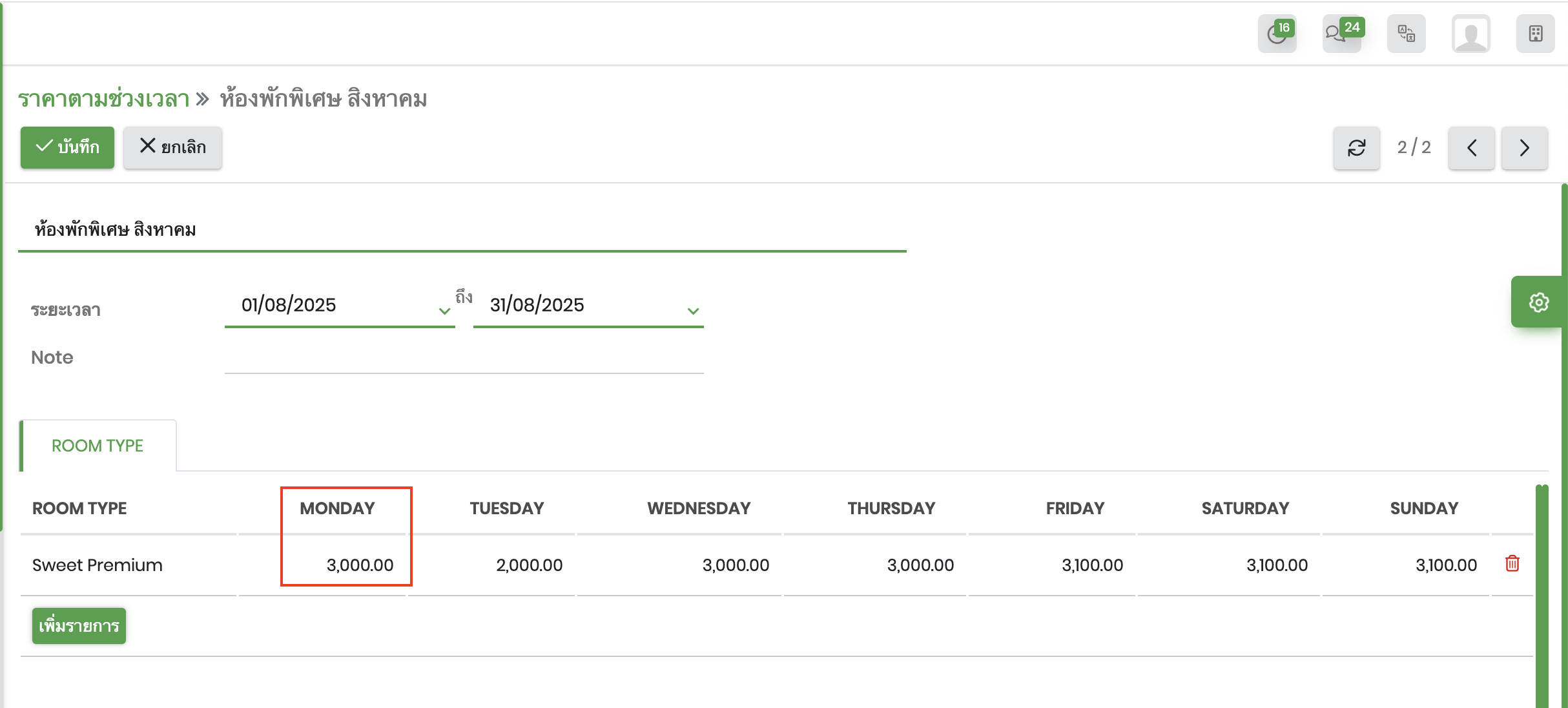 ราคาห้องพักต้องแสดงวันที่ 11- 12 สิงหา ราคาห้องพักแสดงเป็น 3,000.00