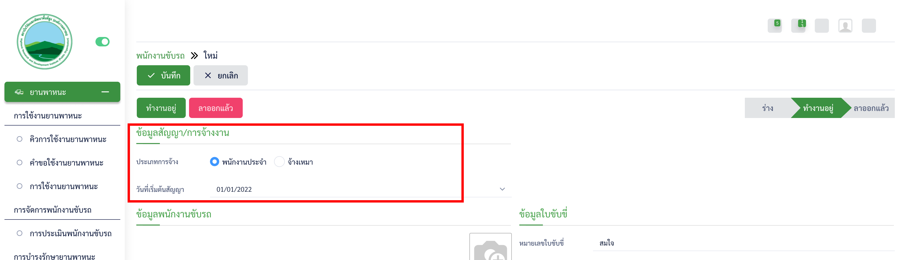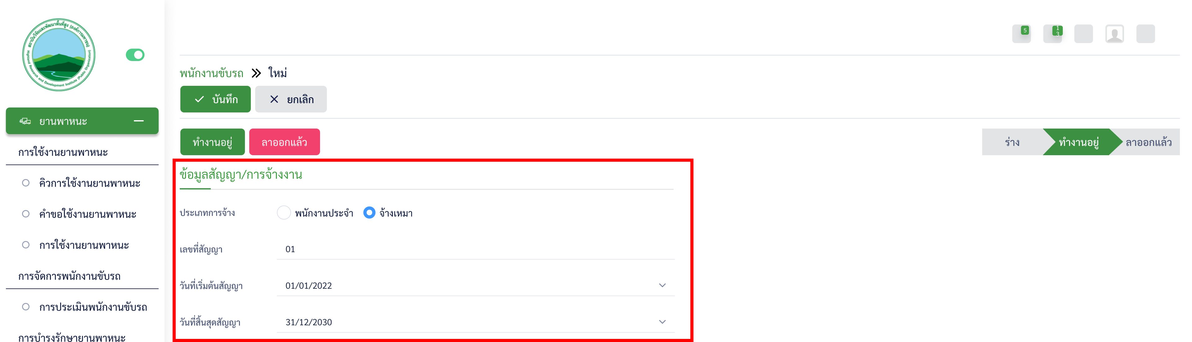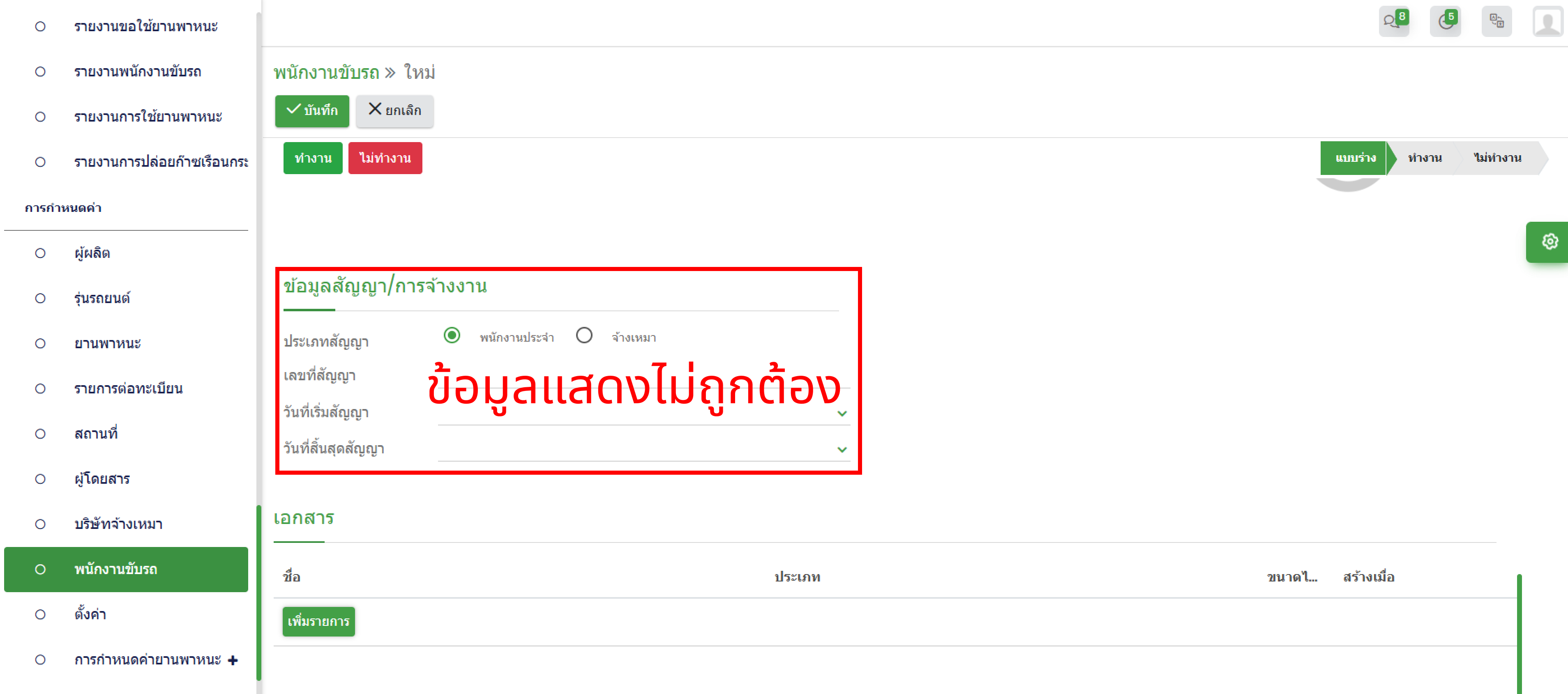 หน้าพนักงานขับรถ > ข้อมูลสัญญา/การจ้างงาน > ประเภทสัญญาไม่ถูกต้อง