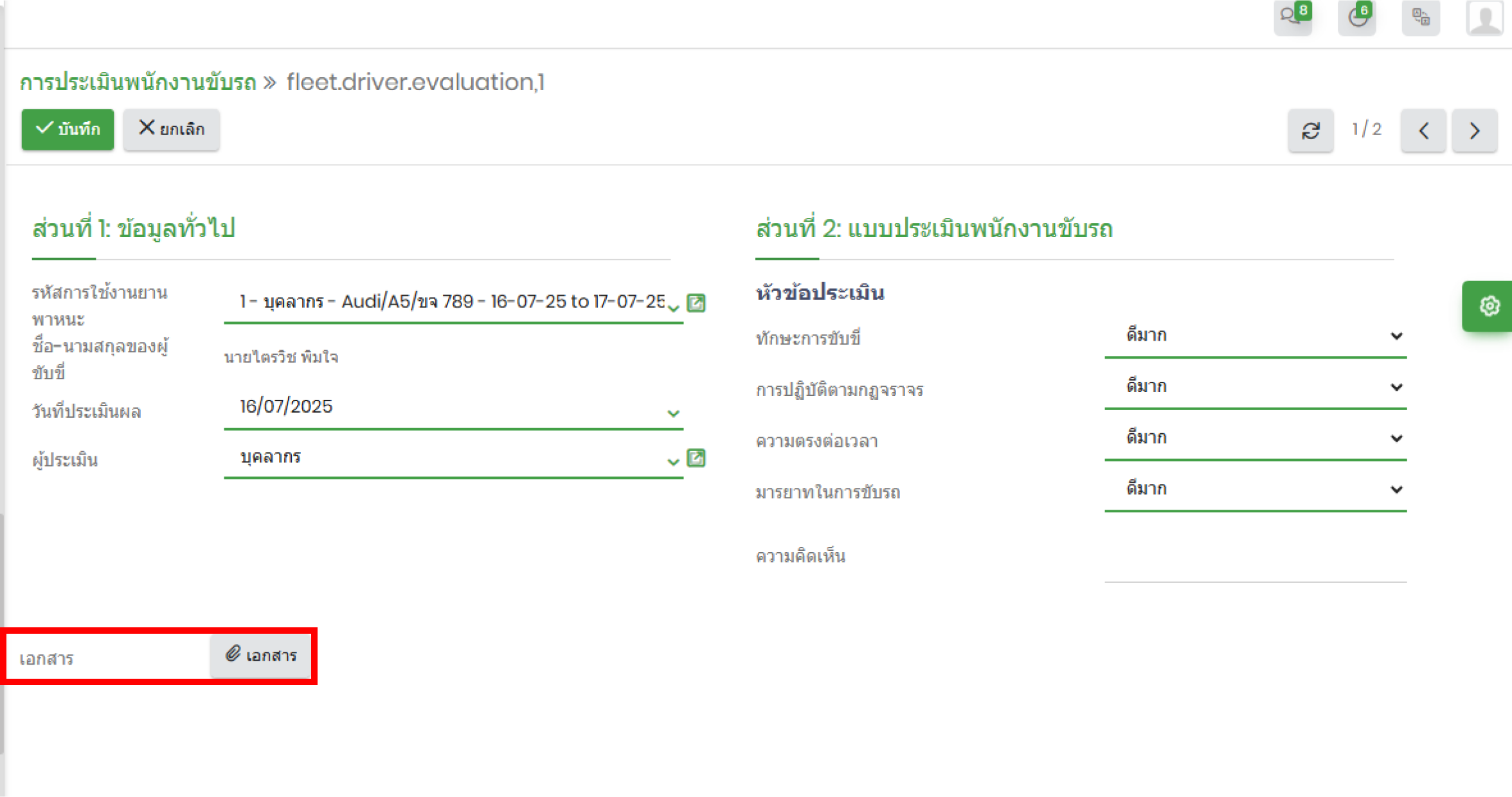 หน้าการประเมินพนักงานขับรถ > เอาไฟล์แนบเอกสารออก