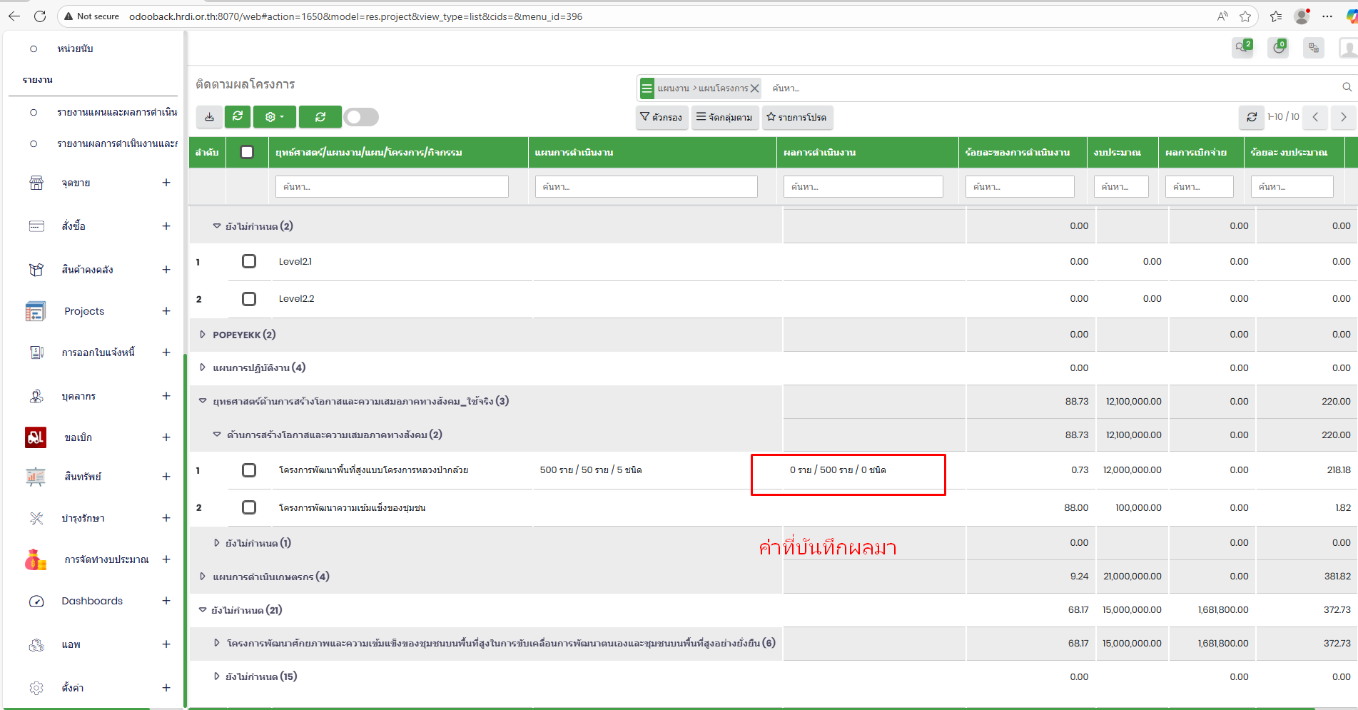 • ข้อมูลผลการดำเนินงาน ไม่แสดงที่คอลัมน์ผล