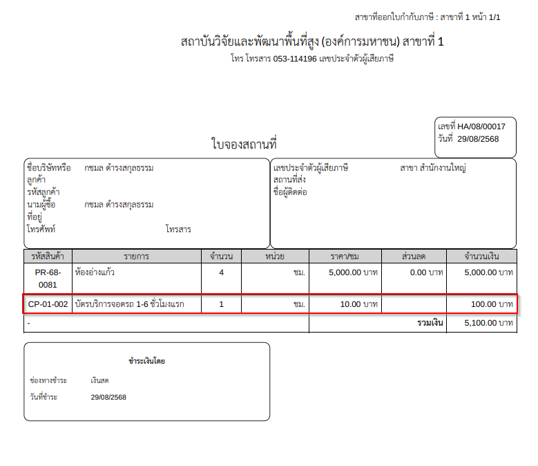 การจองสถานที่ > พิมพ์ใบจอง > กรณีเพิ่มค่า "บริการเสริม" ทำการ "พิมพ์ใบจอง"