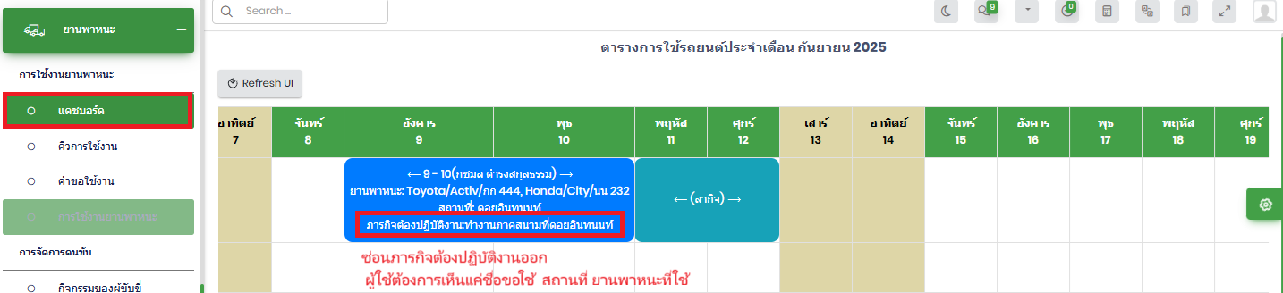 หน้าตารางการใช้ยานพาหนะ(แดชบอร์ด) > ซ่อนภารกิจต้องปฏิบัติงาน
