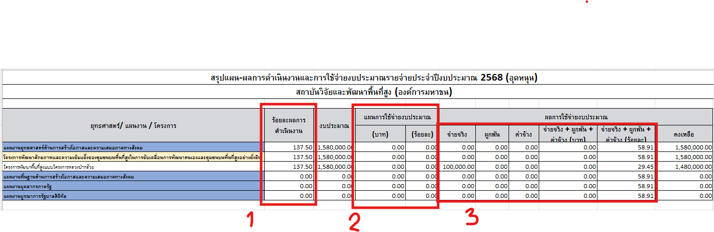 - ร้อยละผลการดำเนินงาน >> ร้อยละของผลการดำเนินงานต้องตรงกับหน้าผลการดำเนินงาน และต้องไม่เกิน 100%
