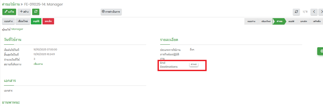 [การใช้งานยานพาหนะ]เมนูคำขอใช้งาน > เปลี่ยนคำว่า "End destianatios" เป็น "สถานที่ปลายทาง