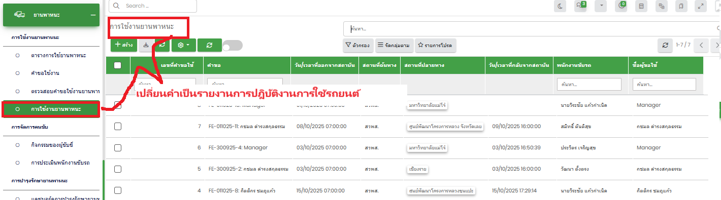 [การใช้งานยานพาหนะ] เมนูการใช้งานยานพาหนะ > เมนู "การใช้งานยานพาหนะ " เปลี่ยนเป็น "รายงานการปฎิบัติงานการใช้รถยนต์"
