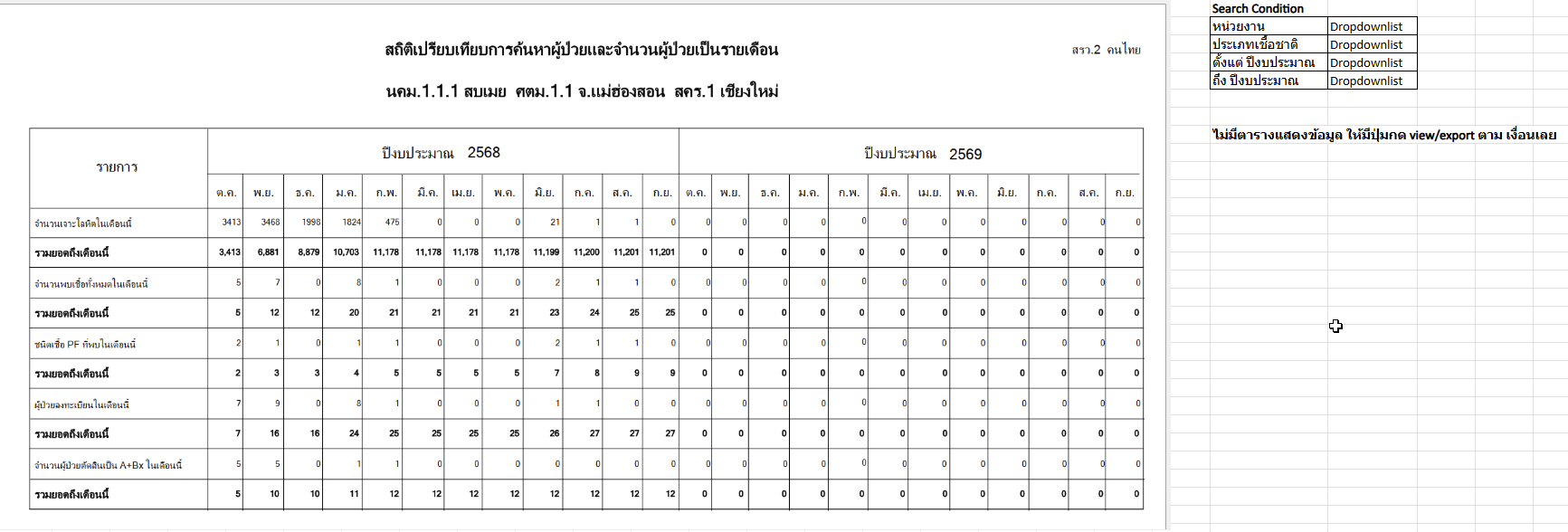 open[รายงาน] รว. > รายงาน สรว.2 สถิติเปรียบเทียบการค้นหาผู้ป่วยและจำนวนผู้ป่วยเป็นรายเดือน