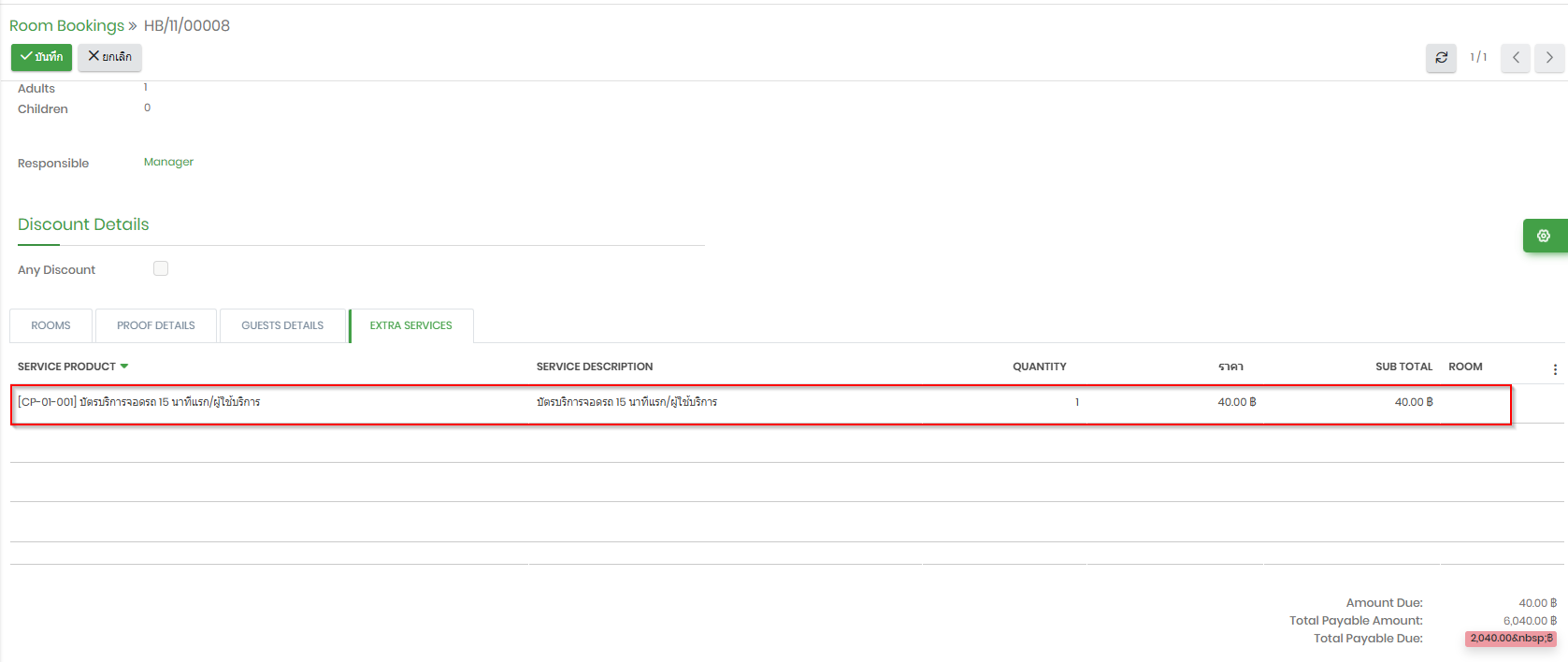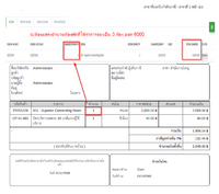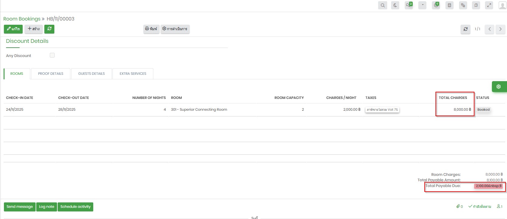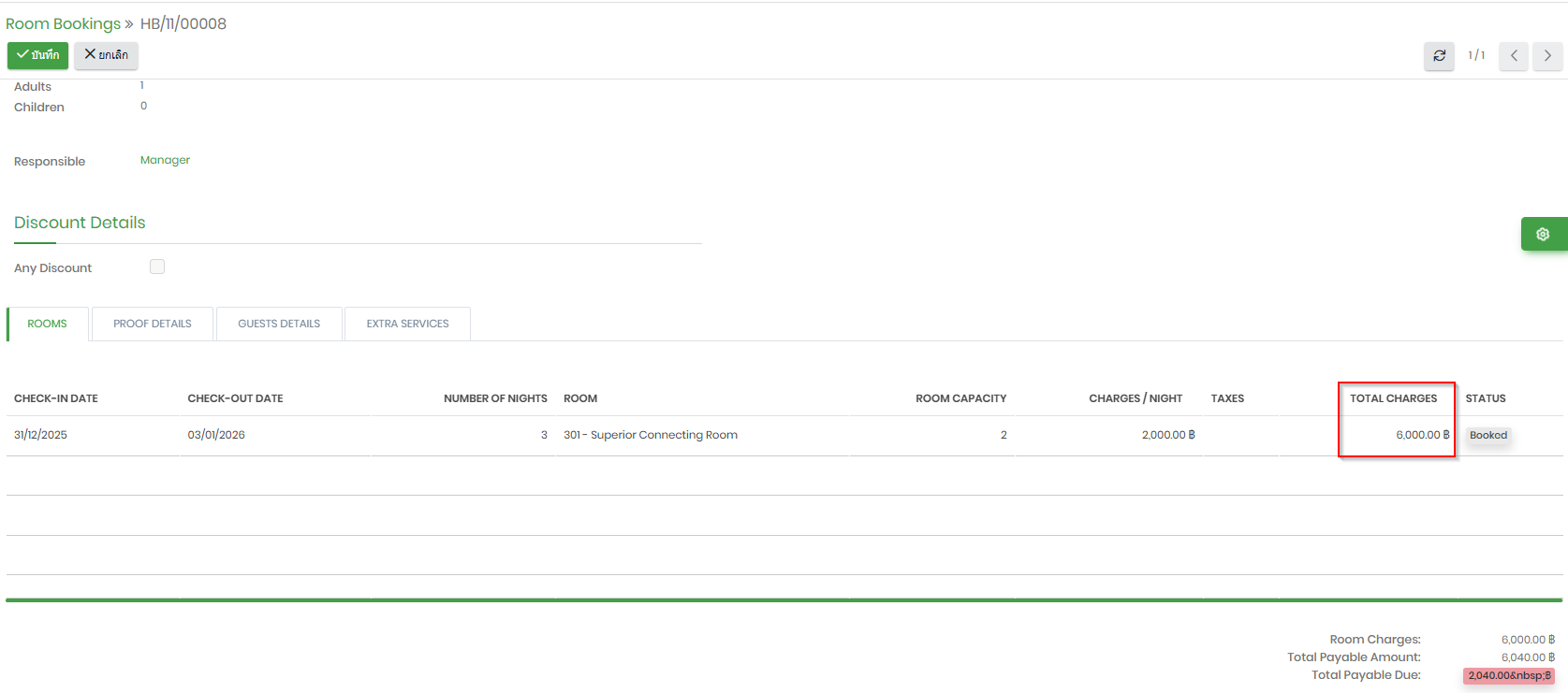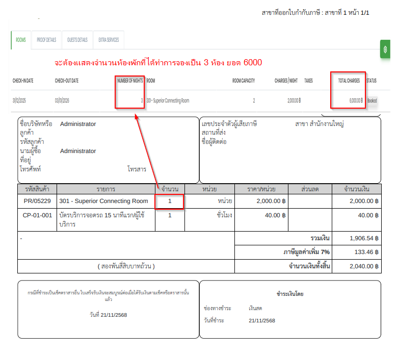closedการจองห้องพัก > สถานะ check out > ปุ่ม พิมพ์ > สร้างใบเสร็จ/ใบกำกับภาษี เมื่อกรอกข้อมูลกรบแล้วกดบันทึก ยอดรวมทั้งหมด ต้องแสดงยอด total charges + Service product (ถ้ามี)