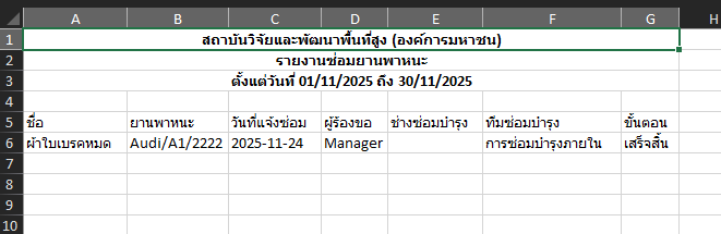 closed[ยานพาหนะ] เมนู รายงานซ่อมยานพาหนะ > Export รายงานแล้ว column ช่างซ่อมบำรุง ไม่แสดงข้อมูล
