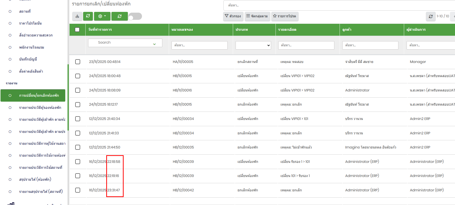 [โรงแรมและสถานที่] รายงาน การเปลี่ยน/ยกเลิกห้องพัก > เวลาที่แสดงใน column วันที่ทำการ แสดงไม่ตรงกับที่ทำการบันทึกจริง