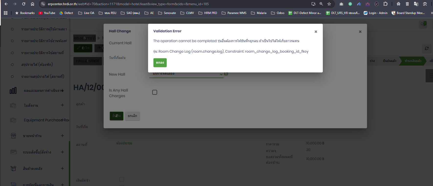 [โรงแรมและสถานที่] จองสถานที่ > Hall Change > ระบบแสดง Validation Error