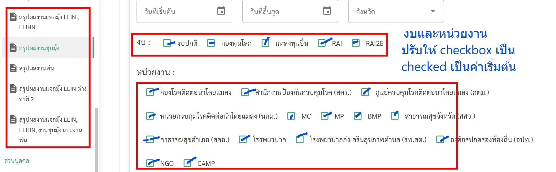 รบกวนปรับให้ checkbox งบ และหน่วยงานเป็น checked เป็นค่าเริ่มต้น ในรายงานคม. ทั้งหมด