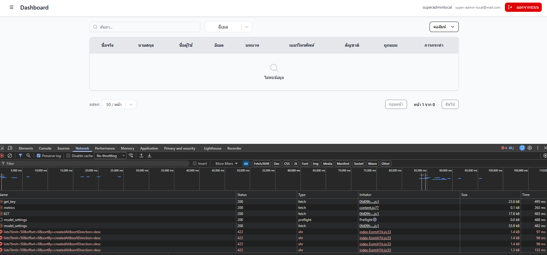 กดแสดง 50/หน้า -> ระบบไม่แสดงรายการ