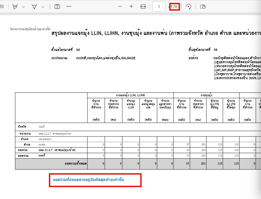 **จากภาพตัวอย่างจะเห็นว่า รายงานอยู่ที่หน้า 1 แต่มีการแสดง "ยอดรวมทั้งหมด" แล้ว