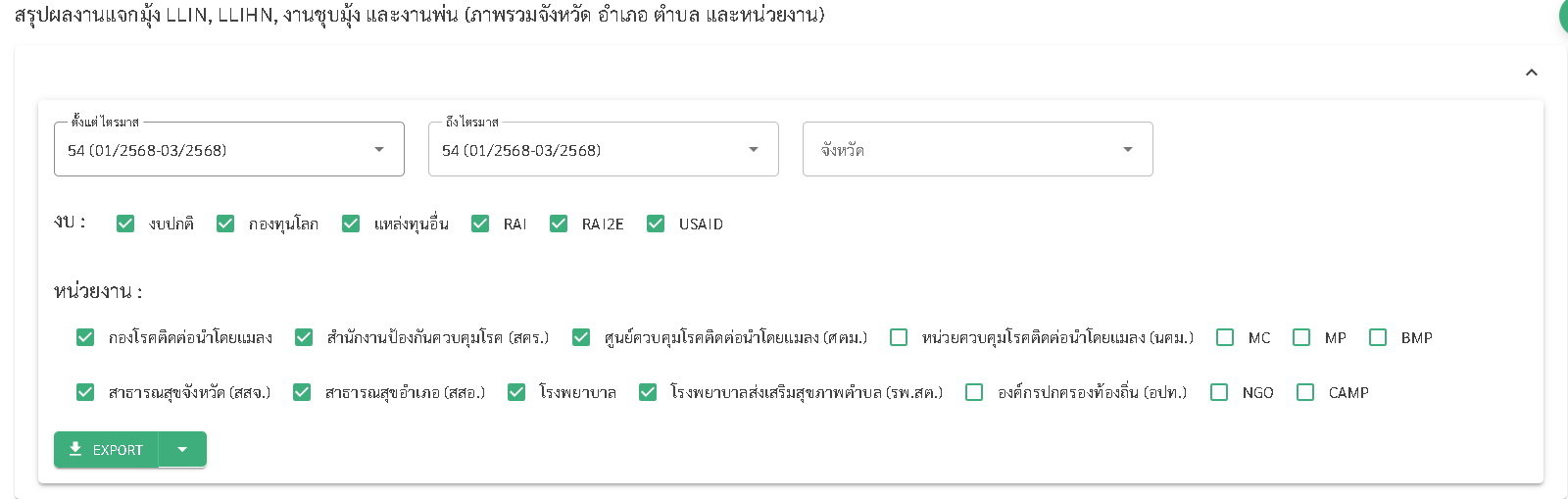 [รายงาน] คม. > สรุปผลงานแจกมุ้ง LLIN, LLIHN, งานชุบมุ้ง และงานพ่น (ภาพรวมจังหวัด อำเภอ ตำบล และหน่วยงาน)