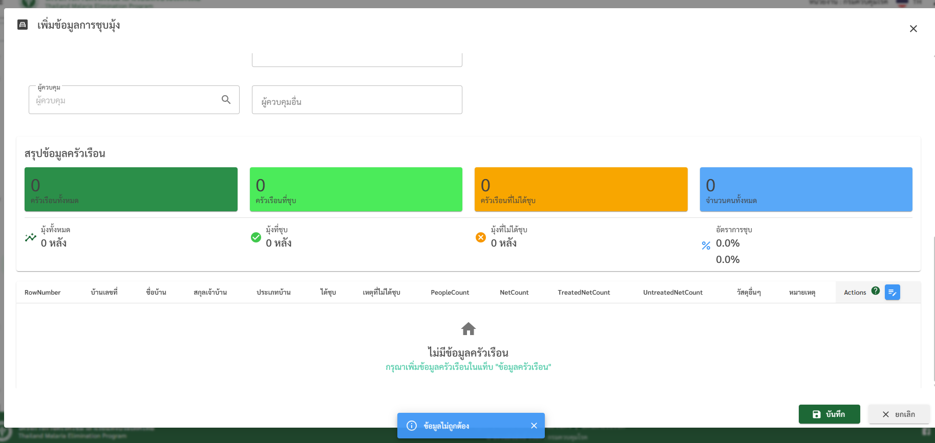 **ตัวอย่างในการเพิ่มข้อมูลชุบมุ้ง ถ้ากรอกข้อมูล tap ข้อมูลพื้นที่ แล้วไม่ได้กรอก tap ข้อมูลครัวเรือน ระบบจะแจ้งเตือนดังรูป