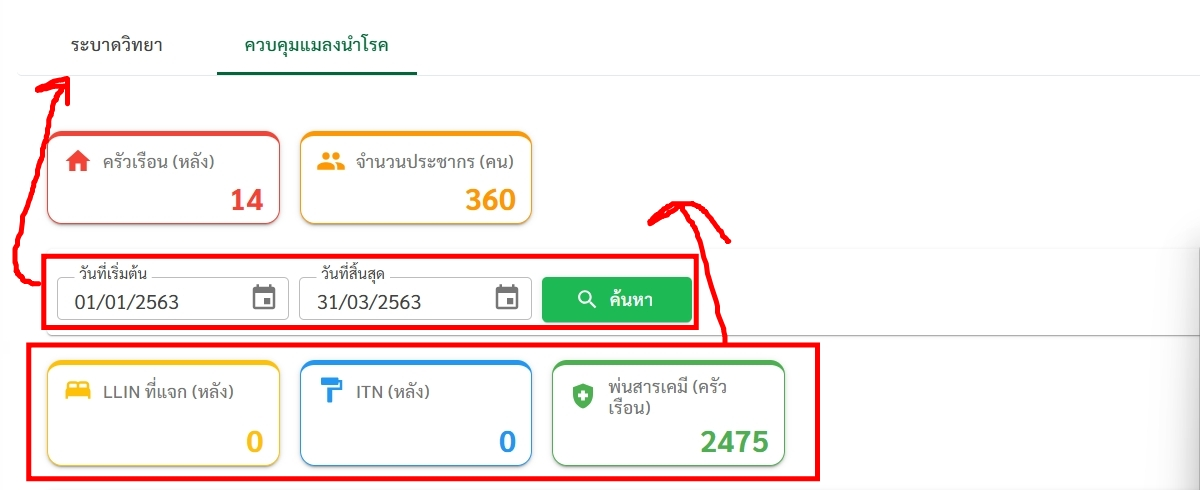 จำนวนประชากร และ จำนวนครัวเรือน ขอปรับให้นับจากยอด transaction ของแต่ละหลังคาเรือน (ไม่ใช่ยอดที่เราคีย์ใน tbl_ms_household) และให้ใช้ filter date เพิ่มเหมือนกล่องข้างล่าง