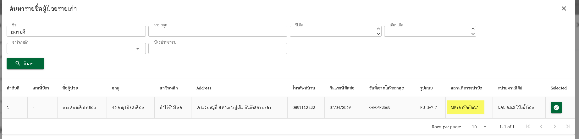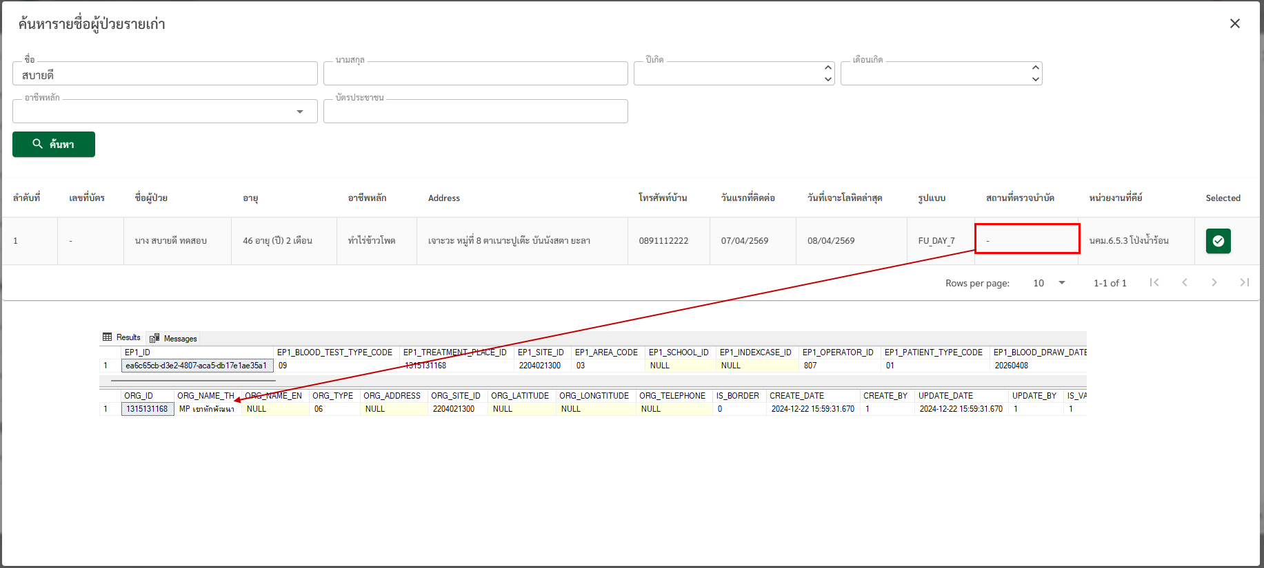 [รว/ระเบียน รว.1] บันทึกข้อมูลรว.1 เต็มรูปแบบ > popup ค้นหาผู้ป่วย ตรวจสอบ column สถานที่ตรวจบำบัด ไม่แสดงค่า